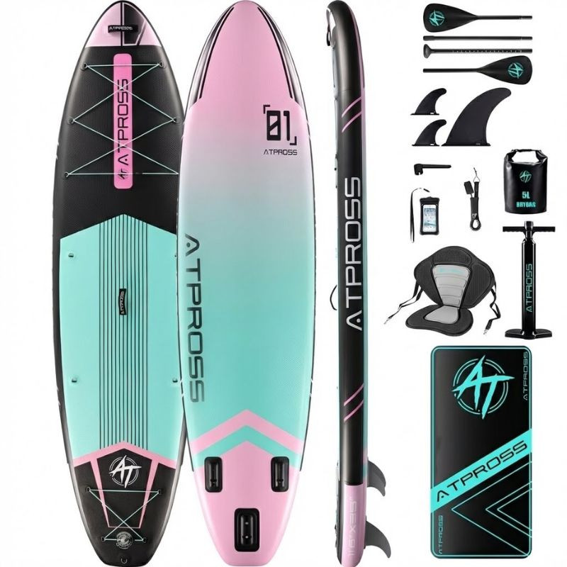 Či už ide o tyrkysovo modrý geometrický vzor alebo čistý čierno-mentolový dizajn, stojacie dosky na pádlovanie ATPROSS boli vyrobené v duchu stability a všestrannosti. Tieto extra široké dosky boli navrhnuté tak, aby poskytovali maximálnu bezpečnosť pri všetkých vodných aktivitách, od dynamického surfovania cez pokojnú jogu pri jazere až po rybolov alebo opaľovanie.Hlavné vlastnosti a výhody Vynikajúca stabilita: Šírka 35 palcov (88,9 cm) poskytuje oveľa väčšiu plochu ako bežné dosky, čo robí SUP mimoriadne stabilným, a je tak ideálnou voľbou pre začiatočníkov aj milovníkov jogy.Masívna nosnosť: Vďaka robustnej konštrukcii je maximálna nosnosť dosiek 450 libier (cca 204,12 kg), takže sa na ňu pohodlne zmestia až dvaja dospelí alebo jeden dospelý a jedno domáce zviera.Odolný a trvanlivý materiál: Vďaka špeciálnemu výrobnému procesu sú dosky odolné voči korózii a fyzickým vplyvom (abrázii), čo zaručuje dlhú životnosť v sladkej aj slanej vode. Vybavenie: Gumové úchyty na prednej a/alebo zadnej strane dosiek pomáhajú bezpečne upevniť batožinu a protisklzový povrch zaručuje stabilitu.