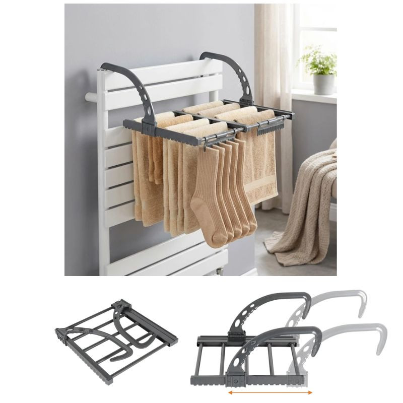 10 sušiacich tyčí poskytuje dostatok miesta na usporiadanie ponožiek, uterákov a menších kusov oblečenia. Konštrukcia, ktorú možno zavesiť na radiátor, umožňuje využiť teplo z kúrenia, vďaka čomu oblečenie rýchlejšie vyschne.