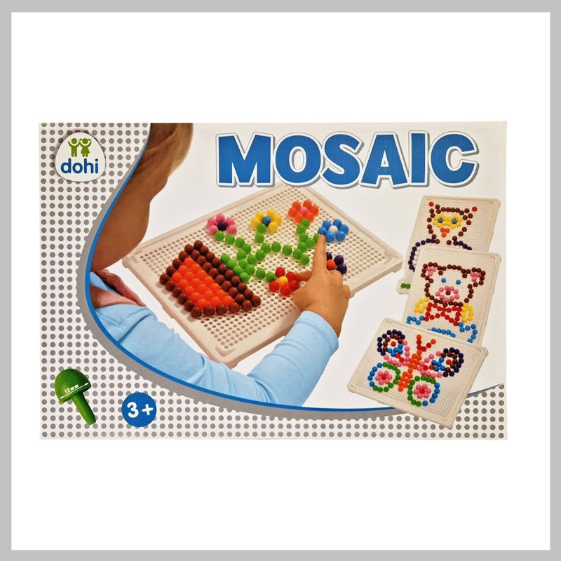 Tvorivé tvorenie Mozaika 26x20cm 094972 Pomocou plastovej dosky a malých farebných „hubiek“ s priemerom 12 mm môžete vytvárať rôzne obrázky. Stačí hubky umiestniť do príslušných otvorov v doske! Sú dostatočne veľké a ľahko sa uchopujú, takže deti ich môžu ľahko vkladať do otvorov. Rozvíja kreativitu, zručnosť, jemnú motoriku a zlepšuje koordináciu rúk a očí. Veľkosť dosky potrebnej na tvorbu: 26 x 20 cm Materiál: plast