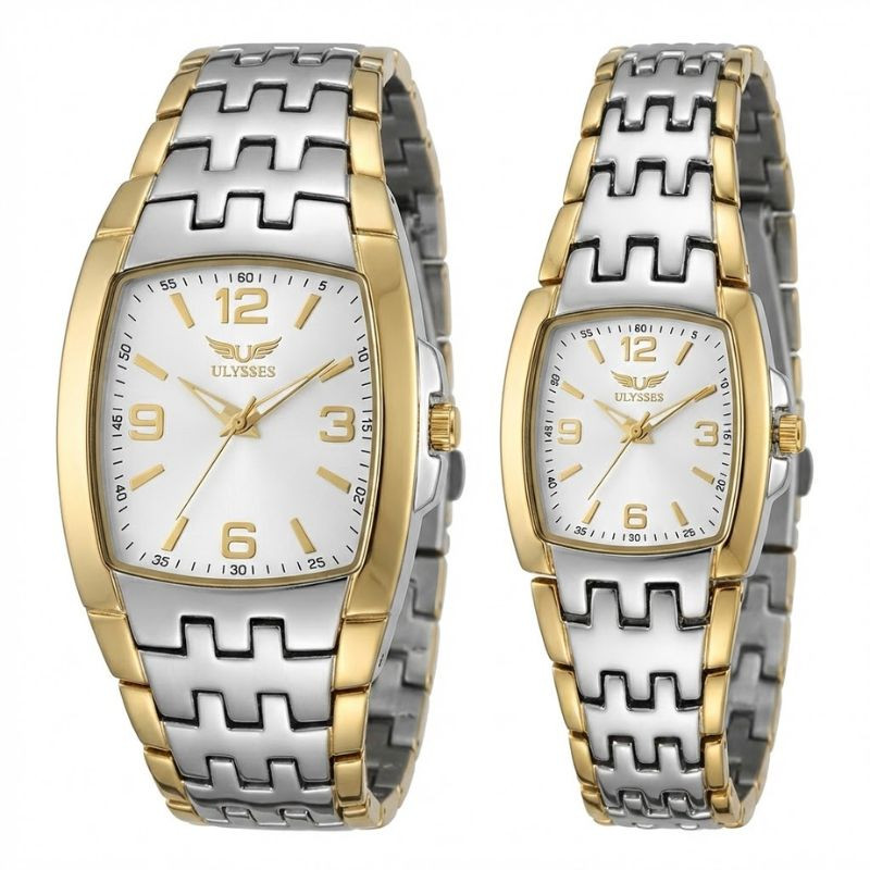Tento párový set ULYSSES obsahuje dve hodinky – pánske a dámske – s elegantným obdĺžnikovým (alebo jemne tonneau/hordó) tvarom puzdra. Kombinácia striebornej a zlatej farby (bicolor) spája chladnú eleganciu striebra s teplým leskom zlata, vďaka čomu hodinky perfektne ladia s inými šperkami, napr. snubnými prsteňmi.