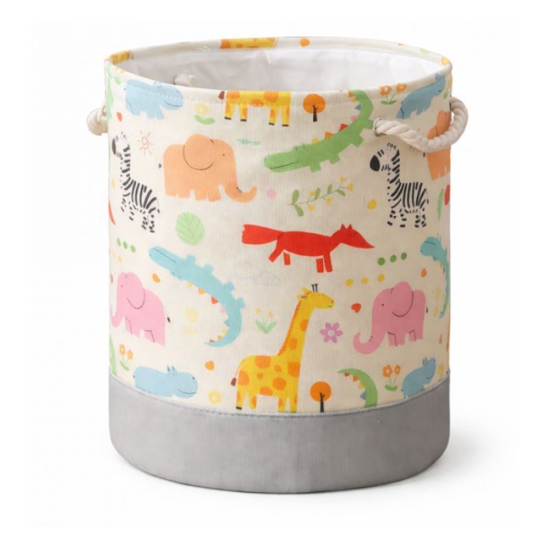Tento úložný kôš zdobený rôznymi zvieratami zo safari – žirafami, slonmi, zebrami a krokodílmi – predstavuje dokonalú rovnováhu medzi škandinávskym štýlom a radosťou detskej izby. Či už ide o hračky, špinavú bielizeň alebo čistú posteľnú bielizeň, tento košík pomáha udržiavať poriadok a zároveň zostáva štýlovou dekoráciou v akejkoľvek miestnosti bytu. Elegantný sivý pás v spodnej časti košíka dodáva produktu moderný vzhľad.