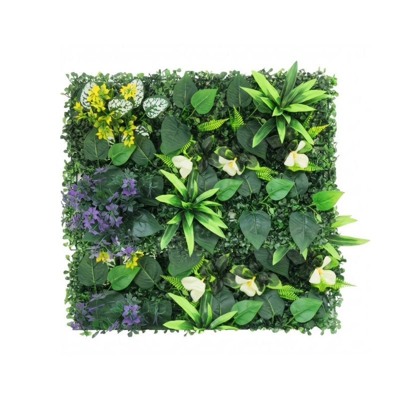 Táto úžasná, realistická umelá rastlinná stena je perfektným riešením, ak si chcete vo svojom domove alebo vonku vytvoriť okamžitú, bezúdržbovú zelenú plochu. Bohatá zeleň – ktorá obsahuje paprade, tropické rastliny so širokými listami, ako aj drobné biele kvety a fialové a žltozelené akcenty – vytvára mimoriadne prirodzený 3D efekt. Vzor dreveného plotu uvedený v popise dodáva konštrukcii extra stabilitu a výborne sa hodí aj ako priestorový delič vytvárajúci súkromie alebo ako clona proti pohľadu.