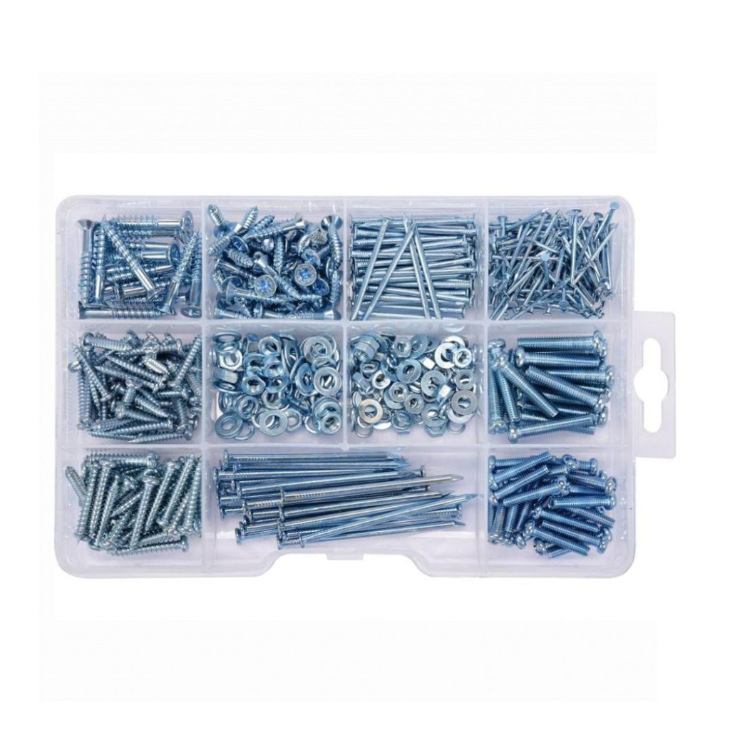 580-dielna upevňovacia sada obsahuje základné skrutky, klince a podložky, ktoré sú nevyhnutné v dielni aj pri domácich majstroch. Vysokokvalitné prvky sú uložené v prehľadnej, praktickej plastovej krabičke, takže sú vždy po ruke a usporiadane uložené.