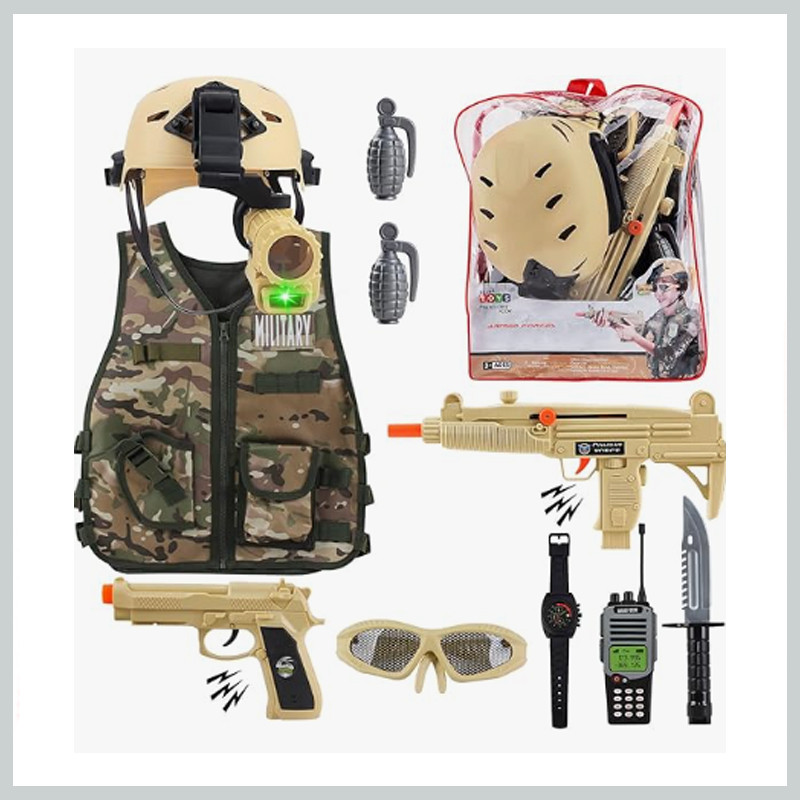 Vojenská sada: uniforma, prilba, prilbová lampa s ďalekohľadom, guľomet, pištoľ, nôž, granát, okuliare, vysielačka, odznak a fľaša.