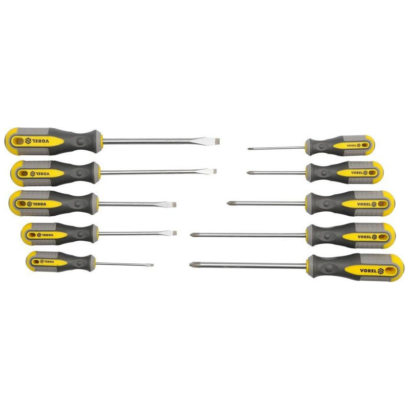 Súprava skrutkovačov Vorel 60970 sa skladá z 10 kusov a je vyrobená z chróm-vanádiovej ocele (CrV). Hroty majú saténový, pieskovaný a magnetický povrch, čo zaisťuje bezpečné držanie hlavy skrutky. Rukoväte sú vyrobené z dvojzložkového plastu a otvor na ich konci umožňuje zavesenie skrutkovačov.