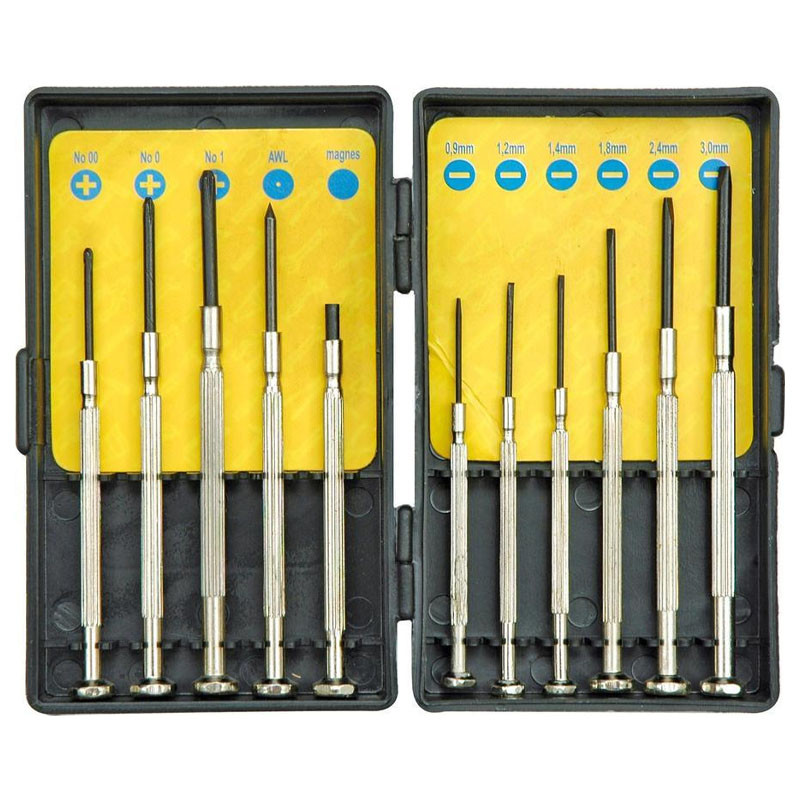 Praktická sada presných skrutkovačov uložená v odolnom plastovom puzdre, vhodná na jemné montážne práce, elektroniku a drobné opravy.
