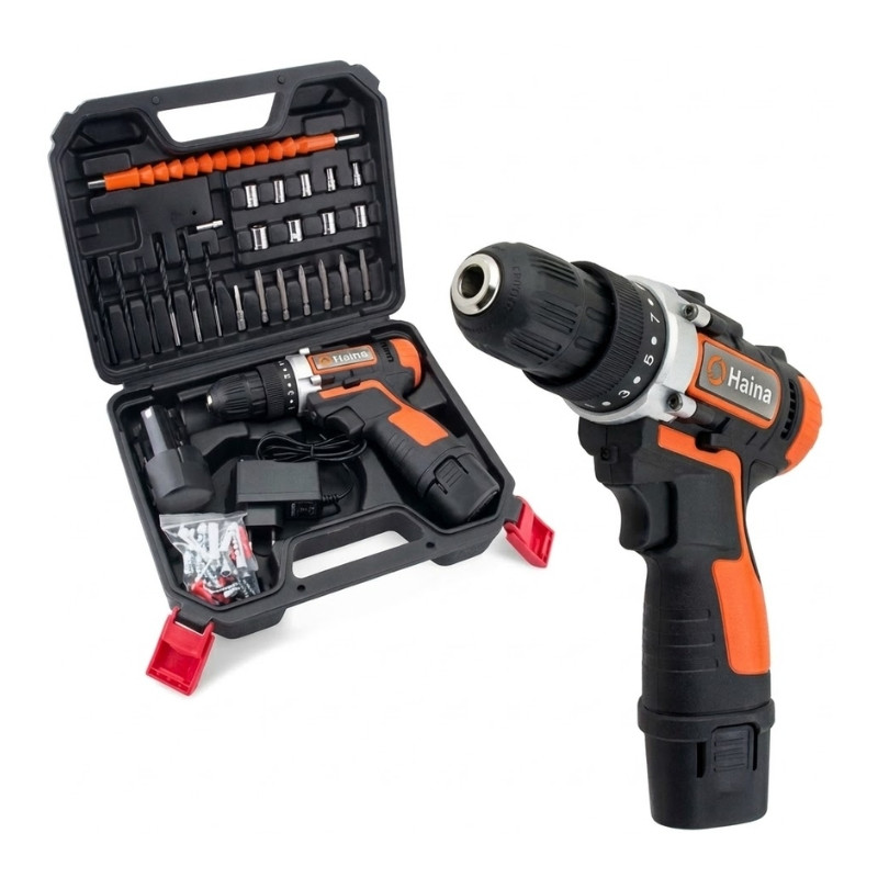 Vŕtačka Haina s náhradnou batériou a príslušenstvom. Stroj je vybavený LCD displejom, ktorý zobrazuje úroveň nabitia. Dva rýchlostné stupne.