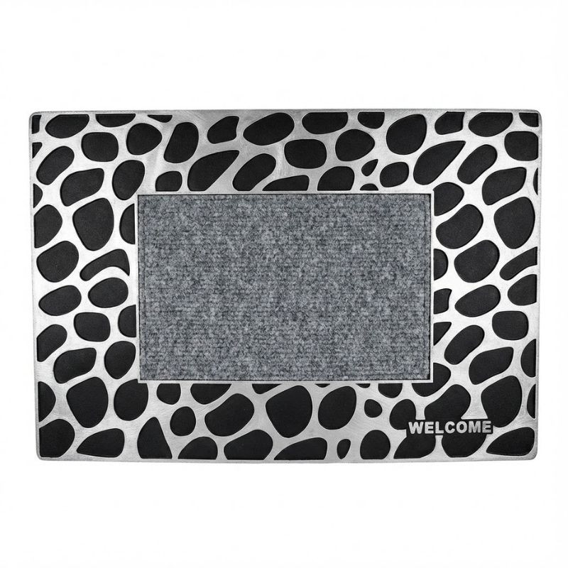 Unikátny dizajn: Široký rám rohože zdobí efektný motív pozostávajúci zo sivých škvŕn na čiernom podklade, pripomínajúci kamienky alebo zvierací vzor. Na pravej strane rámu je vo vertikálnom usporiadaní umiestnený dobre čitateľný nápis Welcome.