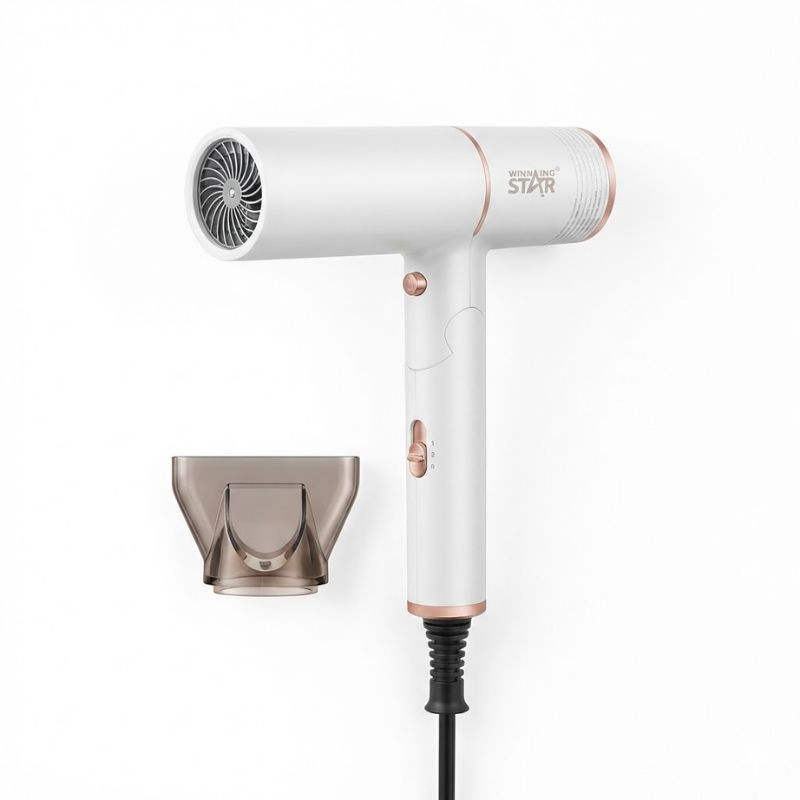 Winning Star ST-5738 spája praktickosť s luxusným dizajnom. Tento biely sušič vlasov s detailmi v ružovom zlate nie je len krásny, ale vďaka skladacej („Foldable“) konštrukcii šetrí miesto. Ideálny na cestovanie, do fitka alebo pre tých, ktorí radi udržujú poriadok v kúpeľňových zásuvkách.