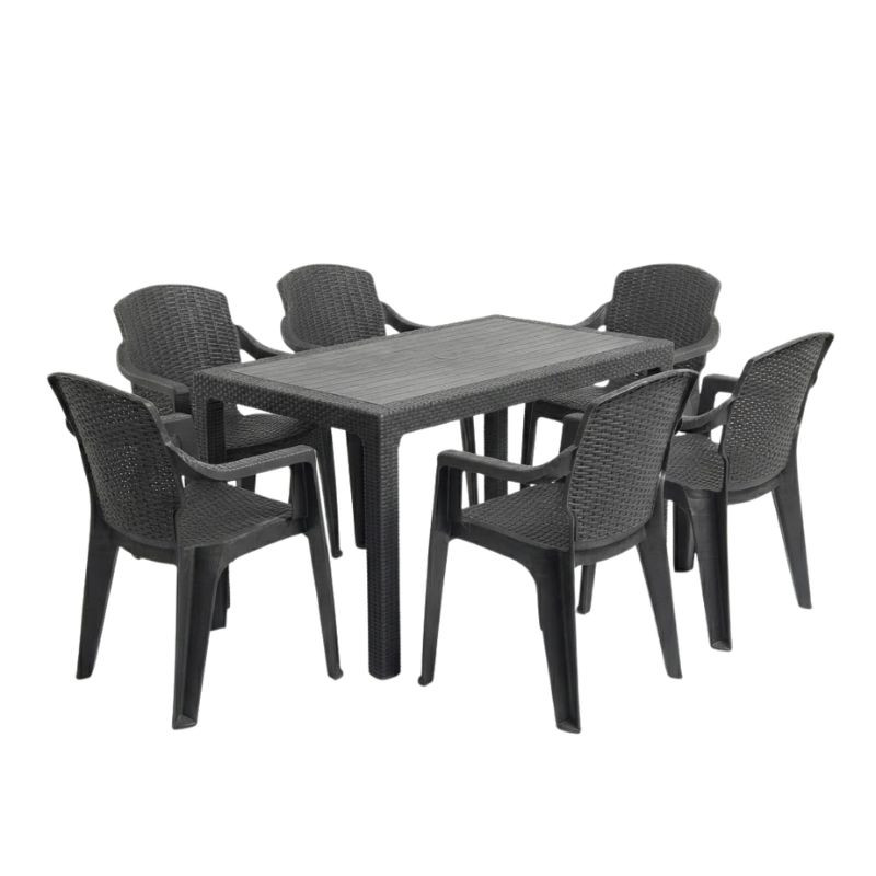 Táto kompletná súprava spája maximálnu funkčnosť s estetickým vzhľadom. Súprava sa skladá z veľkého obdĺžnikového stola a 6 ergonomických kresiel, čím poskytuje pohodlné miesto pre spoločné stolovanie šesťčlennej spoločnosti. Vytlačený 3D ratanový vzor zdobiaci povrch nábytku je nielen efektný, ale dodáva prvkom aj prémiový pocit na dotyk.