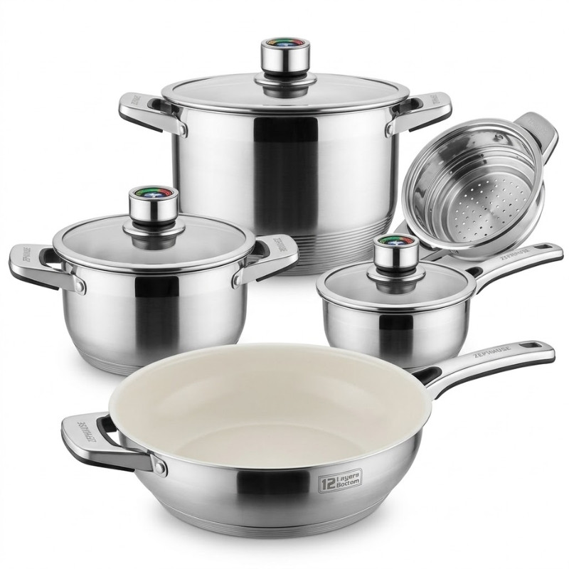 Táto prémiová sada riadu od Zephause International predstavuje spojenie kuchárskeho umenia a modernej technológie. Sada pozostávajúca z 17 kusov bola navrhnutá tak, aby uspokojila všetky potreby, či už ide o dusenie, pečenie alebo viacvrstvové varenie. Zvláštnosťou súpravy je 12-vrstvová konštrukcia dna a systém regulácie teploty zabudovaný do pokrievok.