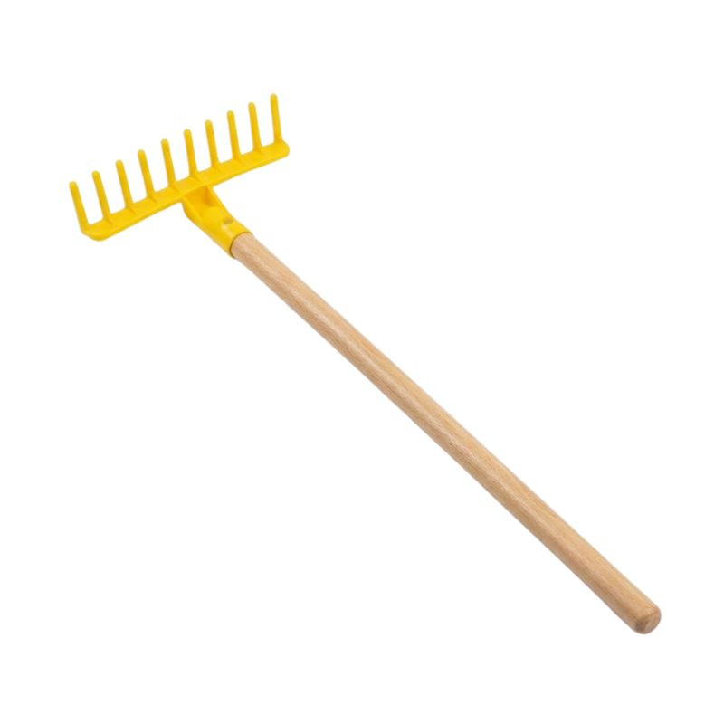 Žltá plastová detská hrablka s drevenou rukoväťou SGG-01
