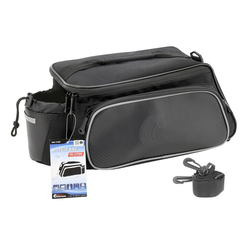 Táto praktická taška na bicykel je ideálna na upevnenie na nosič batožiny nad zadným kolesom. Konštrukcia s 3 priehradkami – jedna veľká hlavná priehradka s objemom 8 litrov a dve bočné priehradky s objemom 1 liter – ponúka dostatočný úložný priestor. Všetky priehradky sú uzatvárateľné na zips a na zadnej strane sa nachádza aj držiak na fľašu.