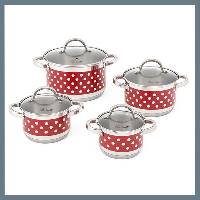 Súprava hrncov Bachmayer 8 dielna nerezová červeno biely bodkovaný dizajn BM-4003