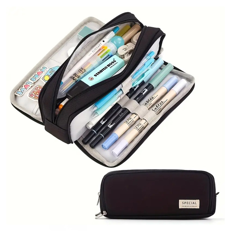 Módne viacvrstvové puzdro na ceruzky s dvojitým priestorom, čierne DK1514948-F