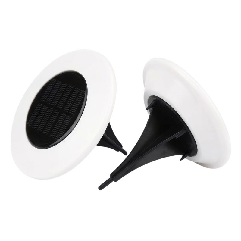Konštrukcia: Okrúhly, plochý tvar s bielym okrajom, v strede ktorého je umiestnený veľký solárny panel. Balenie obsahuje aj čierne plastové kolíky na zapichnutie do zeme, potrebné na upevnenie.