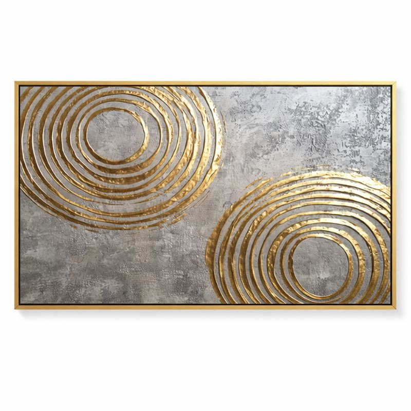 Elegantná a efektná dekorácia na stenu, ktorá vo vašej domácnosti vytvorí modernú a luxusnú atmosféru. Abstraktná kompozícia zobrazuje zlaté kruhové motívy na sivom textúrovanom pozadí, ktoré obrazu dodáva výnimočnú hĺbku a sofistikovaný vzhľad.