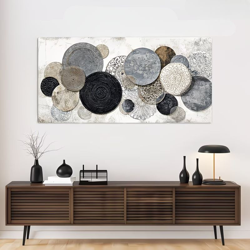 Elegantná a jedinečná dekorácia na stenu, ktorá vo vašej domácnosti vytvorí modernú atmosféru. Abstraktná kompozícia sa skladá z kruhových vzorov rôznych veľkostí a textúrovaných povrchov, ktoré harmonicky do seba zapadajú. Odtiene šedej, béžovej, čiernej a krémovej farby zaisťujú čistý, prirodzený vzhľad, vďaka čomu sa obraz ľahko hodí do moderných a minimalistických interiérov.