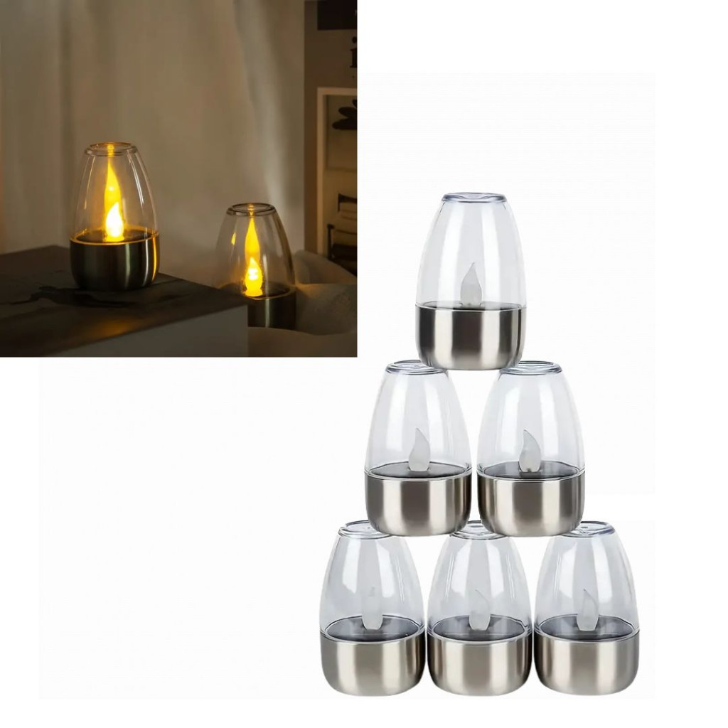 Táto 6-dielna sada solárnych LED sviečok je elegantným a praktickým riešením pre osvetlenie exteriéru. Nerezová základňa a priehľadný kryt jej dodávajú moderný vzhľad, zatiaľ čo teplé biele LED svetlo napodobňuje efekt plameňa. Ideálne pre terasy, záhrady, dekorácie hrobov alebo útulné večerné osvetlenie.