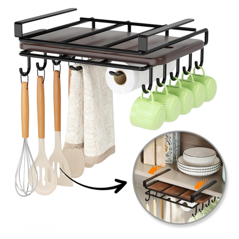 Táto praktická kuchynská organizérska polica, ktorú možno zavesiť pod skrinku, pomáha efektívnejšie využiť priestor v kuchyni. Police s kovovou konštrukciou sa dá ľahko umiestniť na spodnú časť kuchynskej skrinky, čím poskytuje ďalšiu úložnú plochu bez nutnosti vŕtania alebo samostatného upevňovania.