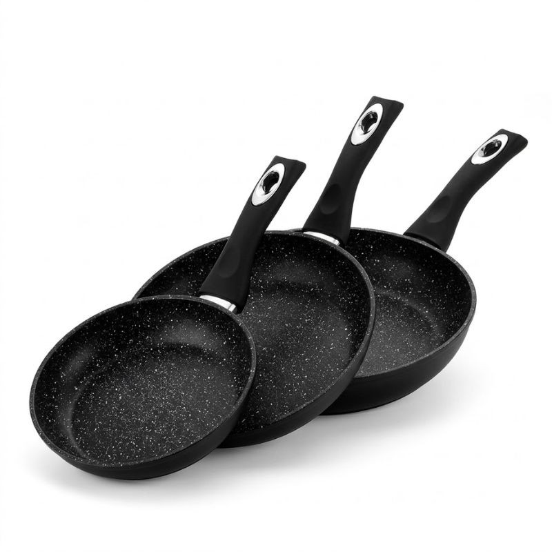 Táto trojdielna sada panvíc značky Royalty Line je elegantnou a praktickou voľbou pre každodenné pečenie a varenie. Sada má klasický čierny vonkajší povrch a ergonomicky tvarované rukoväte, vnútorný povrch má čierny základ s mramorovým vzorom so svetlými bodkami.