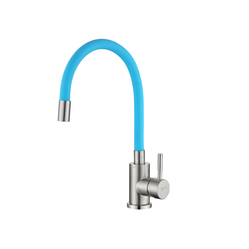Zegor SAP4-F090BU je moderná kuchynská batéria s flexibilnou výpustou, ktorá je ideálna na každodenné používanie. Kombinácia tela z nerezovej ocele a jasne modrej hadice so silikónovým povrchom je nielen estetická, ale aj praktická: hadicu je možné ľahko nasmerovať, čo uľahčuje umývanie a manipuláciu s vodou.