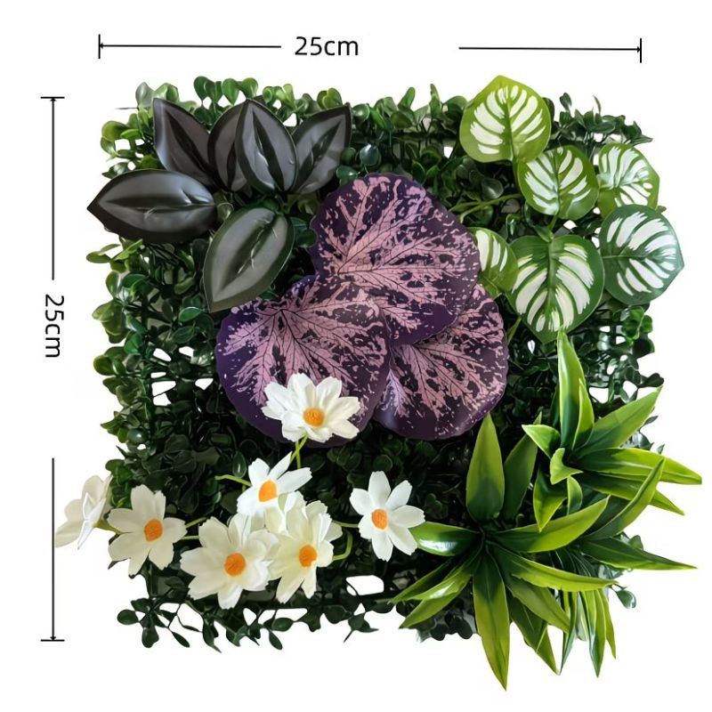 Kompaktný, ale pôsobivý zelený nástenný panel, ktorý vytvára prirodzený dojem v akejkoľvek miestnosti alebo vonkajšom priestore. Panel s rozmermi 25 × 25 cm je vyrobený z kombinácie rôznych listových a kvetinových prvkov, čím zabezpečuje pestrý a realistický celkový dojem.