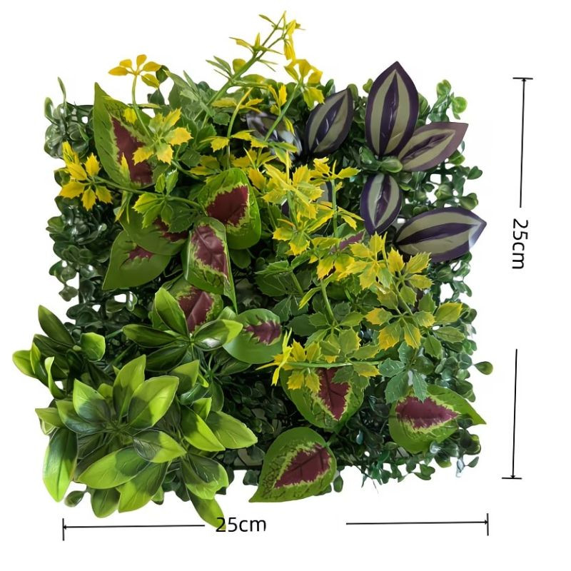 Kompaktný, ale pôsobivý zelený nástenný panel, ktorý vytvára prirodzený dojem v akejkoľvek miestnosti alebo vonkajšom priestore. Panel s rozmermi 25 × 25 cm je vyrobený z kombinácie rôznych listových a kvetinových prvkov, čím zabezpečuje pestrý a realistický celkový dojem.